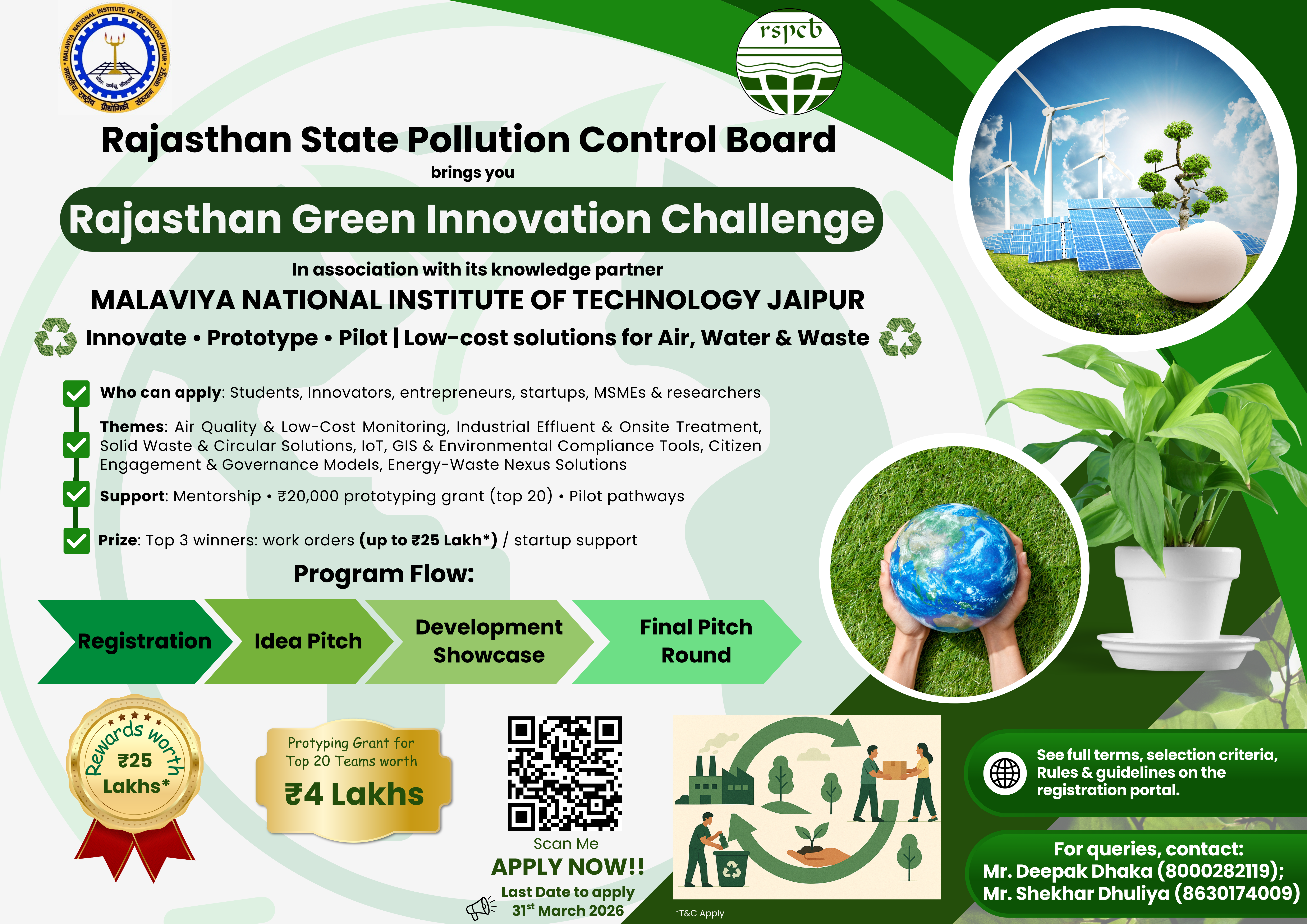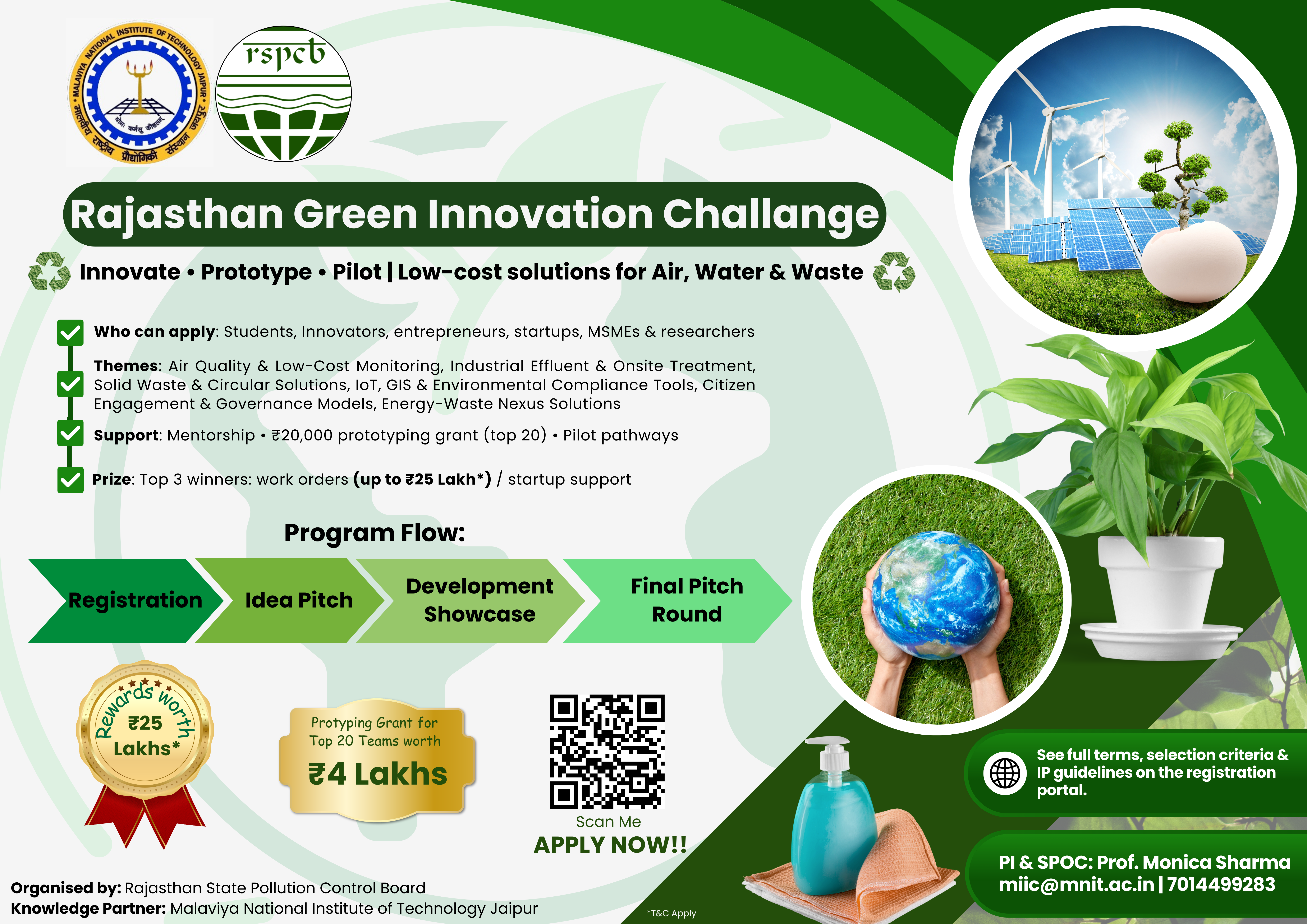 The Rajasthan Green Innovation Challenge (RGIC) is a targeted programme to surface, validate and accelerate locally-relevant technical and behavioural innovations that address pollution and environmental monitoring challenges across Rajasthan. RGIC brings together students, startups, MSMEs, researchers and regulators to convert early-stage solutions into field-tested prototypes and policy-ready demonstrations.